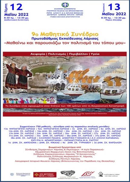 H Διεύθυνση Πρωτοβάθμιας Εκπαίδευσης Λάρισας, διά της Υπεύθυνης Σχολικών Δραστηριοτήτων, διοργανώνει το 9ο Μαθητικό Συνέδριο «Μαθαίνω & Παρουσιάζω τον πολιτισμό του τόπου μου», το οποίο θα υλοποιηθεί την Πέμπτη 12/5/2022 διαδικτυακά και την Παρασκευή 13/5/2022 δια ζώσης. Στο Συνέδριο θα παρουσιάσουν τα αποτελέσματα των ερευνητικών δράσεών τους εφτακόσιοι πενήντα (750) μαθητές και μαθήτριες Προσχολικής και Δημοτικής Εκπαίδευσης.
