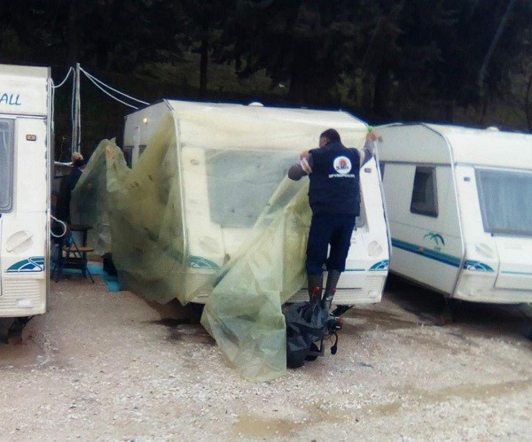 Από τα ξημερώματα που άρχισε η βροχή οι σεισμόπληκτοι προσπαθούν να προστατέψουν με κάθε μέσο τις σκηνές, σκεπάζοντάς τες με νάιλον, ενώ τον δικό τους αγώνα δίνουν και οι διαμένοντες στα τροχόσπιτα που επιστράτευσαν ακόμη και κουβάδες για να μαζέψουν τα νερά που μπαίνουν στο εσωτερικό από τους εξαερισμούς.