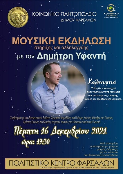 Μουσική εκδήλωση στήριξης και αλληλεγγύης για το Κοινωνικό Παντοπωλείο του Δήμου Φαρσάλων θα πραγματοποιηθεί αύριο Πέμπτη, 16 Δεκεμβρίου, στις 7.30 το βράδυ, στο Πολιτιστικό Κέντρο Φάρσαλων.
