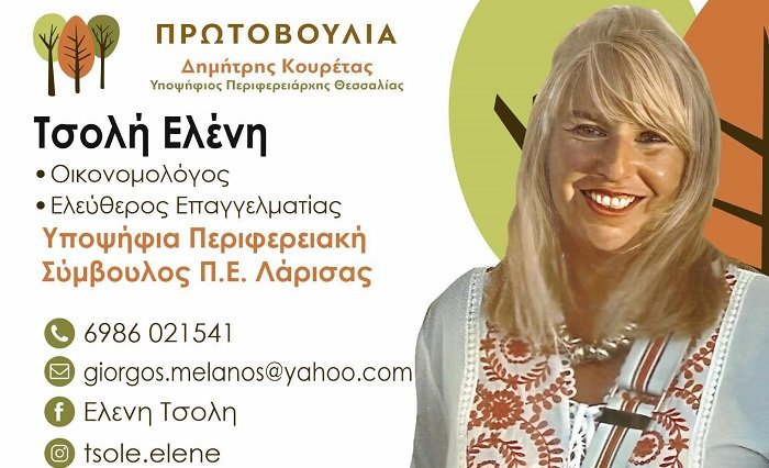 Με στόχο η Θεσσαλία να χαμογελάσει ξανά, η οικονομολόγος και ελεύθερη επαγγελματίας Ελένη Τσολή αποφάσισε να είναι υποψήφια στις εκλογές της Κυριακής με το συνδυασμό Πρωτοβουλία του Δ. Κουρέτα στην Π.Ε. Λάρισας. Η ίδια μας συστήνεται ως εξής: