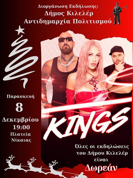 Με το δημοφιλές συγκρότημα Kings θα ανάψει φέτος το χριστουγεννιάτικο δέντρο στη Νίκαια, την Παρασκευή 8 Δεκεμβρίου, στην κεντρική πλατεία στις 7:00 το απόγευμα. Ο Δήμος Κιλελέρ προσκαλεί και φέτος όλες και όλους στη μεγάλη γιορτή, με τους KINGS να δίνουν το ρυθμό της βραδιάς.