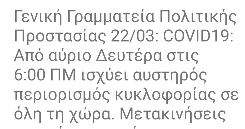 Νέο μήνυμα απέστειλε στους πολίτες η Γενική Γραμματεία Πολιτικής Προστασίας μετά τις ανακοινώσεις της κυβέρνησης για απαγόρευση κυκλοφορίας.