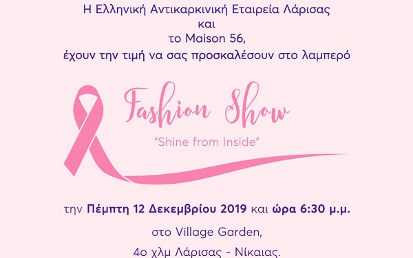 Με θέμα την εσωτερική λάμψη (shine from inside) και στόχο την ενίσχυση των δράσεων του Παραρτήματος Λάρισας της Αντικαρκινικής Εταιρείας, πραγματοποιείται αύριο Πέμπτη 12 Δεκεμβρίου στις 6.30 μ.μ. στο Village Garden ένα από τα μεγαλύτερα κοσμικά γεγονότα της χρονιάς, η επίδειξη μόδας που διοργανώνουν η Αντικαρκινική Εταιρεία και το κατάστημα Maison 56.
