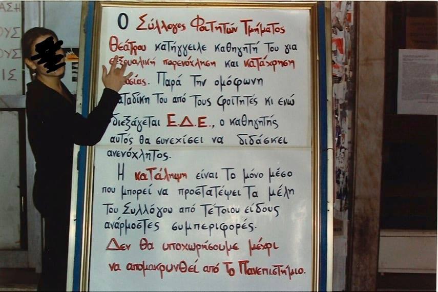 «1997. Μπροστά από το Τμήμα Θεάτρου του Α.Π.Θ., ένα πλακάτ (αναγνωρίζω τα γράμματά μου) ενημερώνει τους περαστικούς για τους λόγους της κατάληψης στο κτήριο, που διήρκησε σχεδόν δύο μήνες. Ήταν μία από τις εξαιρέσεις, όπου τα θύματα ενός καθηγητή που παρενοχλούσε φοιτήτριές του μεθοδικά, δόλια και αναίσχυντα μίλησαν μεταξύ τους, μίλησαν με τους άλλους συμφοιτητές και συμφοιτήτριές τους και όλοι μαζί στάθηκαν απέναντι στη χυδαιότητα. Ήμασταν ένα μικρό τμήμα, με μια συντριπτική πλειοψηφία κοριτσιών (έλειπε, δηλαδή, αυτό που λέμε σήμερα τοξική αρρενωπότητα). Είχαμε, βέβαια, την τύχη να είναι τότε πρύτανης ένας συντηρητικός, αλλά ακέραιος άνθρωπος, ο Αντώνης Μάντης, ο οποίος χωρίς καθυστερήσεις, δεύτερες σκέψεις και υπεκφυγές (τις οποίες είχαμε συναντήσει στα χαμηλότερα επίπεδα της ακαδημαϊκής ιεραρχίας) ανέθεσε τη διενέργεια ΕΔΕ σε μια γυναίκα νομικό, αδιαμφισβήτητου κύρους, την Έφη Κουνουγέρη- Μανωλεδάκη. Αφού εξέτασε τις επτά (αν θυμάμαι καλά) καταγγέλλουσες (καθώς και τους αντίστοιχους μάρτυρες υπεράσπισης), κατέληξε σε ένα πόρισμα-καταπέλτη κατά του καθηγητή, το οποίο οδήγησε στο αίτημα οριστικής απόλυσής του από το πανεπιστήμιο. Το αίτημα έγινε άμεσα αποδεκτό από τον Υπουργό Παιδείας, Γεράσιμο Αρσένη. Είναι η μόνη περίπτωση που γνωρίζω απόλυσης από το πανεπιστήμιο με την κατηγορία της σεξουαλικής παρενόχλησης και της κατάχρησης εξουσίας.