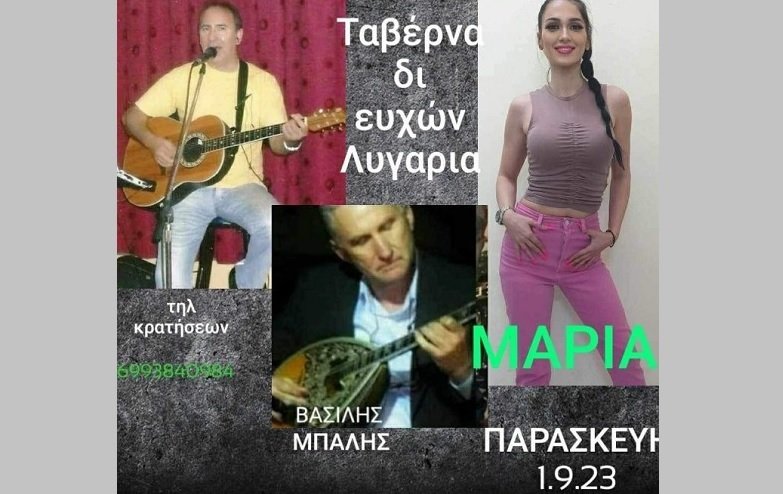 Η γνωστή ταβέρνα «Δι’ Ευχών» στη Λυγαριά Τυρνάβου διοργανώνει σήμερα Παρασκευή 1 Σεπτεμβρίου μουσική βραδιά με πολλά γνωστα και αγαπημένα τραγούδια.
