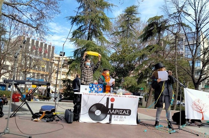 Στην κεντρική πλατεία βρέθηκαν τα παραρτήματα Λάρισας και Καρδίτσας του ΠΜΣ, ο ΣΕΔΙΛ, η Ένωση Επαγγελματιών Μουσικών στην Νυχτερινή Διασκέδαση καθώς και μέλη του ΣΕΗ.