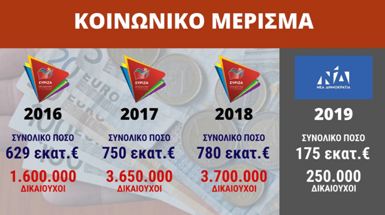 Ας ρωτήσουν τον κ. Μητσοτάκη γιατί από κοινού με τον κ. Σταικούρα μέχρι πριν από λίγους μήνες χαρακτήριζαν «ψίχουλα» το κοινωνικό μέρισμα των 629 εκατ. ευρώ που μοιράστηκε από την κυβέρνηση ΣΥΡΙΖΑ σε 1,6 εκατ. συνταξιούχους το 2016, αυτό των 750 εκατ. ευρώ σε 3.650.000 δικαιούχους το 2017 και των 780 εκατ. ευρώ σε 3.700.000 δικαιούχους το 2018;