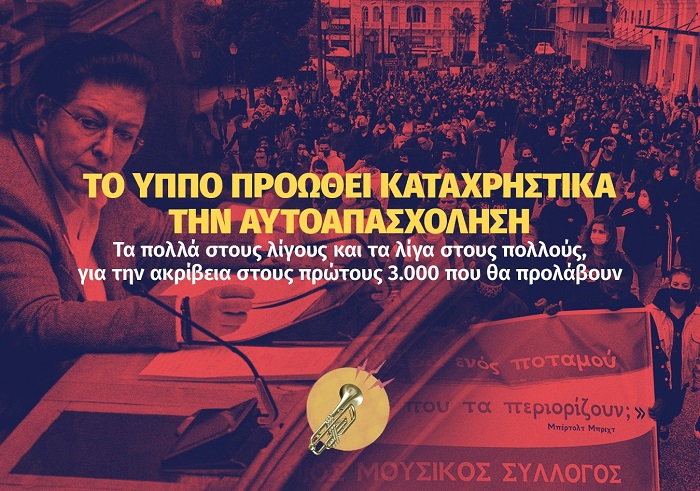 Το ΥΠΠΟ σήμερα προωθεί καταχρηστικά την αυτοαπασχόληση για τους εργαζόμενους του κλάδου, ακόμα και σε εποπτευόμενους από αυτό φορείς. Χρηματοδοτεί με άγνωστα ποσά ιδρύματα για μελέτες που θα «βαφτίζουν το κρέας ψάρι». Όλα αυτά για να ρίξουν στην πλάτη μας το κόστος της ασφάλισης , για να απαλλαγούν οι εργοδότες από κάθε εργασιακό δικαίωμα που έχει απομείνει στην εργατική νομοθεσία.