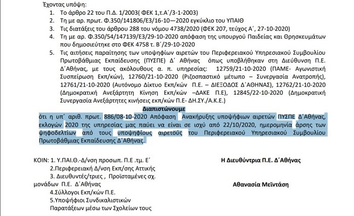 “Διαπιστώνουμε ότι η υπ΄ αριθ. πρωτ. 886/08-10-2020 Απόφαση Ανακήρυξης υποψήφιων αιρετών ΠΥΣΠΕ Δ΄Αθήνας, εκλογών 2020 της υπηρεσίας μας παύει να είναι σε ισχύ από 22/10/2020, ημερομηνία άρσης των ψηφοδελτίων από τους υποψηφίους αιρετούς του Περιφερειακού Υπηρεσιακού Συμβουλίου Πρωτοβάθμιας Εκπαίδευσης Δ΄Αθήνας.