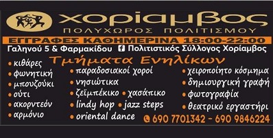 Ξεκίνησαν οι εγγραφές για τη νέα σχολική χρονιά στον Πολιτιστικό Σύλλογο «Χορίαμβος»! Ωράριο εγγραφών και ενημέρωσης των εκδηλώσεων και των δρώμενων της νέας σχολικής χρονιάς καθημερινά 18.00 – 22.00.