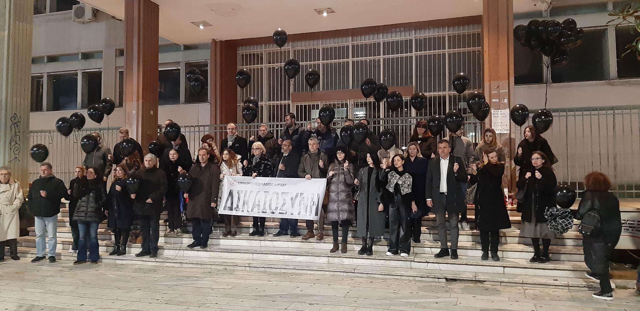 Κρατώντας πανό που έγραφε τη λέξη δικαιοσύνη και μαύρα μπαλόνια στα χέρια τους οι δικηγόροι της Λάρισας μετά από πρωτοβουλία της διοίκησης του συλλόγου τους συγκεντρώθηκαν το βράδυ της Πέμπτης στα σκαλιά του Δικαστικού Μεγάρου και πραγματοποίησαν σιωπηλή συγκέντρωση διαμαρτυρίας για την τραγωδία των Τεμπών που στοίχησε τη ζωή σε 57 κυρίως νέους ηλικιακά ανθρώπους.
