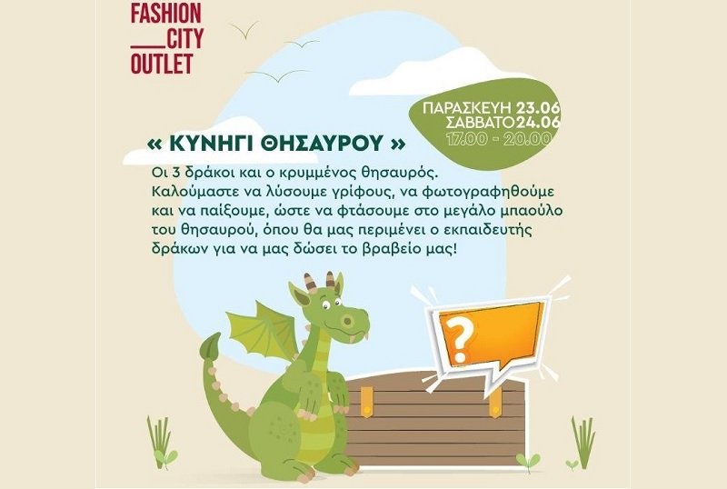 Απίθανο Κυνήγι Θησαυρού θα πραγματοποιηθεί μόνο για σήμερα Παρασκευή 23/6 και αύριο Σάββατο 24/6 στο Fashion City Outlet από τις 17:00 έως τις 20:00.