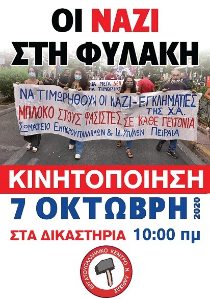 Καλούμε τους εργαζόμενους, τα εργατικά Σωματεία, τους μαζικούς φορείς της νεολαίας, των γυναικών και συνολικά τους μαζικούς φορείς του εργατικού λαϊκού κινήματος να πάρουν άμεσα αποφάσεις συμμετοχής για κινητοποίηση στις 7 Οκτώβρη , στις 10:00πμ , έξω από τα Δικαστήρια εδώ στην Λάρισα, μέρα απόφασης για τους ναζιστές της Χρυσής Αυγής απαιτώντας να τιμωρηθούν οι ναζί εγκληματίες. Καλούμε κάθε εργαζόμενο, κάθε νέο, κάθε λαϊκό άνθρωπο να ενώσουμε τις φωνές μας ενάντια στην βαρβαρότητα του Φασισμού, να γκρεμίσουμε την αδικία!