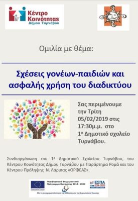 Το 1ο Δημοτικό Σχολείο Τυρνάβου, το Κέντρο Κοινότητας Δήμου Τυρνάβου με Παράρτημα Ρομά και το Κέντρο Πρόληψης Ν. Λάρισας «ΟΡΦΕΑΣ» συνδιοργανώνουν ομιλία με θέμα «Σχέσεις γονέων – παιδιών και ασφαλής χρήση του διαδικτύου»