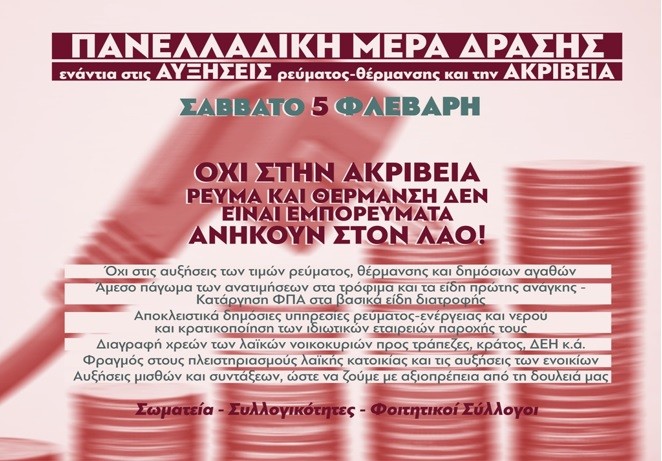 Ένα κύμα ανατιμήσεων στην ενέργεια (ηλεκτρισμός, φυσικό αέριο) αλλά και σε βασικά προϊόντα και κοινωνικά αγαθά έρχεται να ολοκληρώσει τη λεηλασία του πενιχρού λαϊκού εισοδήματος μαζί με την ανεργία, τους μισθούς πείνας, την ελαστική εργασία, την φτωχοποίηση των μικροεπαγγελματιών. Οι αυξήσεις ήδη έχουν στραγγίσει το πορτοφόλι μας και χιλιάδες λαϊκά νοικοκυριά αδυνατούν να πληρώσουν θέρμανση και ηλεκτρισμό.