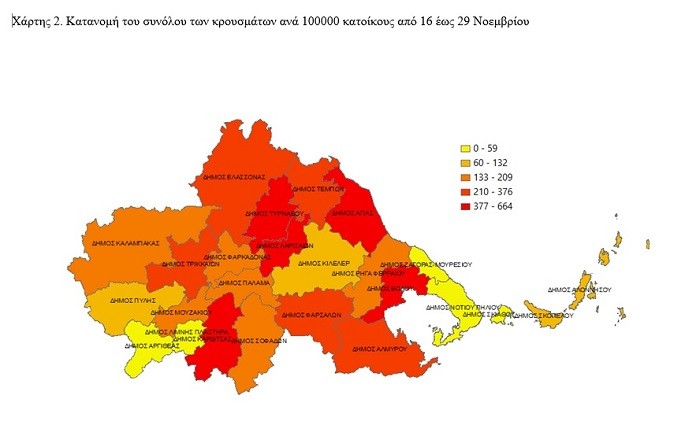 Ο παρακάτω πίνακας και οι χάρτες αποτυπώνουν τη γεωγραφική κατανομή των συνολικών κρουσμάτων και της επίπτωσης COVID-19 από 14 Μαρτίου έως 15 Νοεμβρίου και από 16 έως 29 Νοεμβρίου ανά Καλλικρατικό Δήμο της Περιφέρειας Θεσσαλίας, με βάση την δηλωθείσα διεύθυνση μόνιμης κατοικίας του κρούσματος ή τη διεύθυνση προσωρινής διαμονής για τους τουρίστες και άλλους προσωρινά διαμένοντες στην Ελλάδα. Συμπεριλαμβάνονται τόσο κρούσματα με ιστορικό ταξιδιού (“εισαγόμενα”) όσο και κρούσματα με πιθανή εγχώρια μετάδοση.