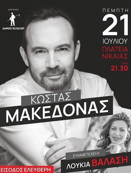 Ο Κώστας Μακεδόνας, συνοδεία των μουσικών του, θα εμφανιστεί την Πέμπτη 21 Ιουλίου στις 21:30 στην πλατεία της Νίκαιας, σε συναυλία με ελεύθερη είσοδο, που διοργανώνει η Αντιδημαρχία Πολιτισμού του Δήμου Κιλελέρ. Το καλλιτεχνικό σχήμα υπόσχεται να μας χαρίσει μια από τις πιο όμορφες μουσικές βραδιές του καλοκαιριού με τα υπέροχα τραγούδια του.