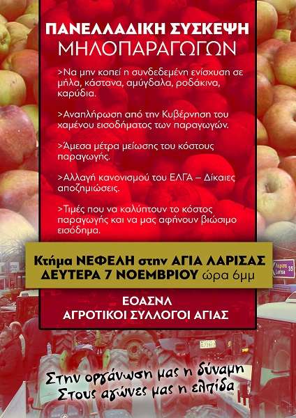 Η Ενωτική Ομοσπονδία Αγροτικών Συλλόγων Νομού Λάρισας (ΕΟΑΣΝΛ) και οι Αγροτικοί Σύλλογοι της Αγιάς στα πλαίσια του προγράμματος δράσης της Πανελλαδικής Επιτροπής Μπλόκων, πραγματοποιούν πανελλαδική σύσκεψη από όλες τις μηλοπαραγωγικές περιοχές την Δευτέρα 7 Νοεμβρίου και ώρα 6μμ στο Κτήμα Νεφέλη στην Αγιά.