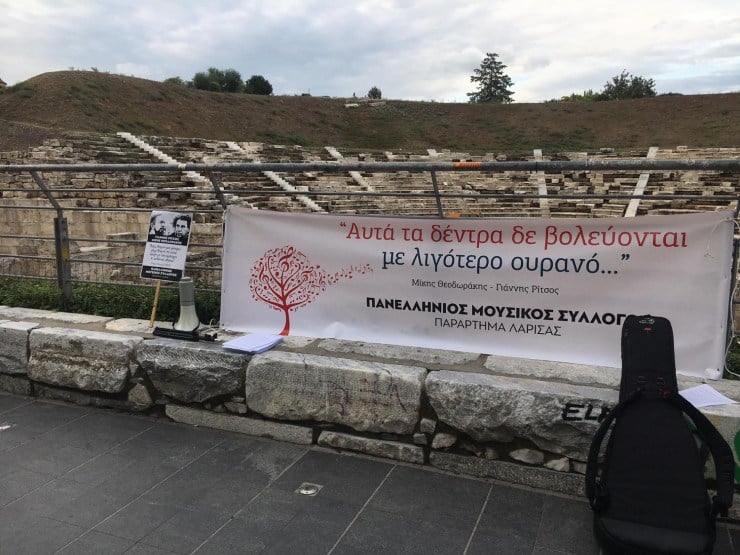 Τιμώντας τη μνήμη του Μ. Θεοδωράκη τα μέλη του Παραρτήματος Λάρισας του Πανελλήνιου Μουσικού Συλλόγου ανάρτησαν πανό, σημειώνοντας παράλληλα πως παλεύουν για την επιβίωσή τους ενόψει του χειμώνα «που όπως όλα δείχνουν θα χαρακτηριστεί από την υπολειτουργία των χώρων εργασίας και τις μεγάλες πιέσεις για να μειωθούν ακόμα περισσότερο οι αμοιβές τους».