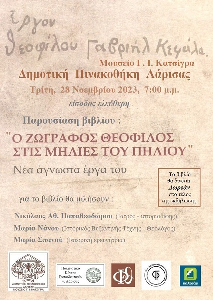 Παρουσιάζεται το βιβλίο : «Ο ζωγράφος Θεόφιλος στις Μηλιές του Πηλίου», του Νικολάου Αθ. Παπαθεοδώρου στο αμφιθέατρο της Δημοτικής Πινακοθήκης Λάρισας, την Τρίτη, 28 Νοεμβρίου 2023, στις 7:00 μ.μ. από το Πολιτιστικό Κέντρο Εκπαιδευτικών νομού Λάρισας – ΠΟΚΕΛ, την Ομάδα «Φωτοθήκη Λάρισας» του Ομίλου Φίλων Θεσσαλικής Ιστορίας, το Σύλλογο Φίλων Δημοτικής Πινακοθήκης Λάρισας και το βιβλιοπωλείο «Καλτσάς».