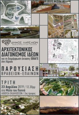 Την Μεγάλη Τρίτη 23-4-2019 και ώρα 12.30 μ.μ. θα γίνει παρουσίαση την προτάσεων που βραβεύτηκαν στον Πανελλήνιο Αρχιτεκτονικό Διαγωνισμό για τη “Διαμόρφωση της έκτασης ΕΘΙΑΓΕ στη Λάρισα”από τους μελετητές, στο Μύλο Παππά,