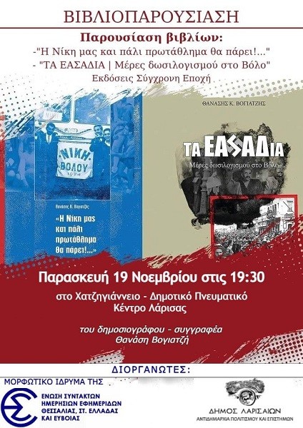 Τα δύο βιβλία του “ΕΑΣΑΔια- Μέρες Δωσιλογισμού στο Βόλο” και “η Νίκη μας και πάλι, πρωτάθλημα θα πάρει” των εκδόσεων Σύγχρονη Εποχή του δημοσιογράφου συγγραφέας Θανάσης Κ. Βογιατζή παρουσιάζει η Αντιδημαρχία Πολιτισμού & Επιστημών Δήμου Λαρισαίων και η Ένωση Συντακτών Θεσσαλίας -Στερεάς Ελλάδας- Εύβοιας, την Παρασκευή 19 Νοεμβρίου στις 19:30 στο Χατζηγιάννειο Πνευματικό Κέντρο.