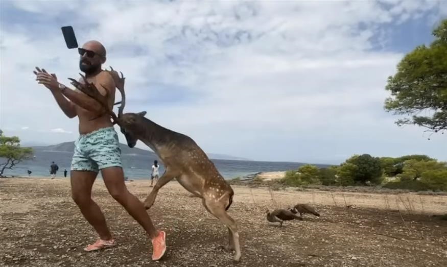 Η προσπάθεια ενός τουρίστα να φωτογραφίσει ένα ελάφι στην Αίγινα δεν είχε την καλύτερη κατάληξη, αφού το ζώο τον χτύπησε με τα κέρατά του και του έσπασε τα πλευρά, όπως φαίνεται σε ένα βίντεο που κάνει τον γύρο του διαδικτύου.