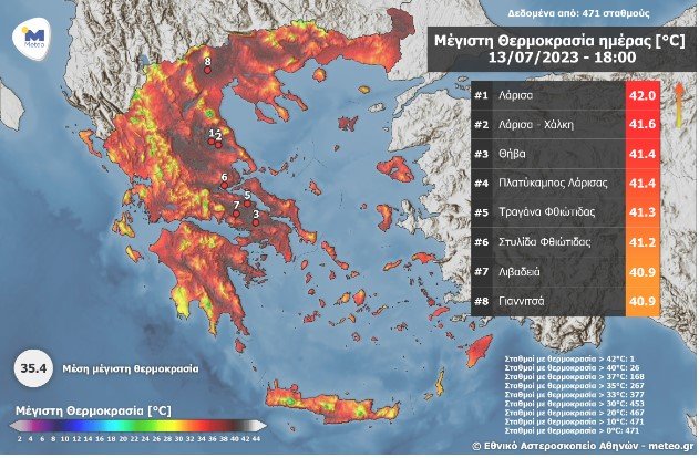 Στους 42° C σκαρφάλωσε χθες ο υδράργυρος στη Λάρισα κάνοντας πρωταθλήτρια την πόλη και γενικά το μεγαλύτερο μέρος του νομού στις θερμοκρασίες που σημειώθηκαν σε όλη τη χώρα με την επέλαση του Κλέωνα.