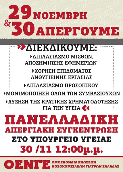Οι γιατροί του Δημόσιου Συστήματος Υγείας απεργούν στις 29-30 Νοεμβρίου διεκδικώντας αναβάθμιση της παροχής των υπηρεσιών και δωρεάν Δημόσια Υγεία. Διαμαρτύρονται για την υποστελέχωση και το κλείσιμο Τμημάτων, Κλινικών και ολόκληρων Νοσοκομείων. Για τις πολύωρες και εξαντλητικές εφημερίες τους .