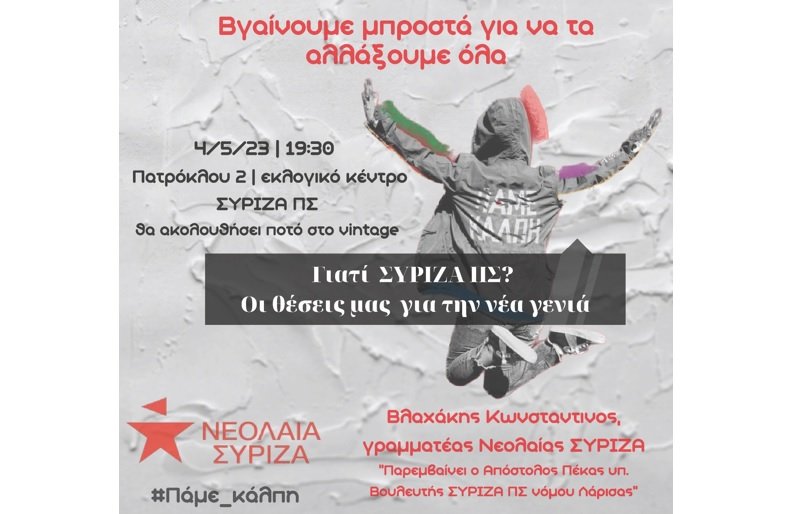 Ως νεολαία ΣΥΡΙΖΑ Λάρισας στο πλαίσιο της προώθησης των θέσεων του ΣΥΡΙΖΑ ΠΣ εν όψει των εκλογών της 21ης Μαΐου σας καλούμε την Πέμπτη 4/5 στις 19:30 μπροστά από το εκλογικό κέντρο του ΣΥΡΙΖΑ ΠΣ ΛΑΡΙΣΑΣ (Πατρόκλου 2) σε μια παρουσίαση των βασικών θέσεων του κόμματος για τη νέα γενιά αλλά και σε μια ανοιχτή, χωρίς περιορισμούς συζήτηση για ότι μας απασχολεί ως νέους ανθρώπους και θέλουμε να αλλάξει.