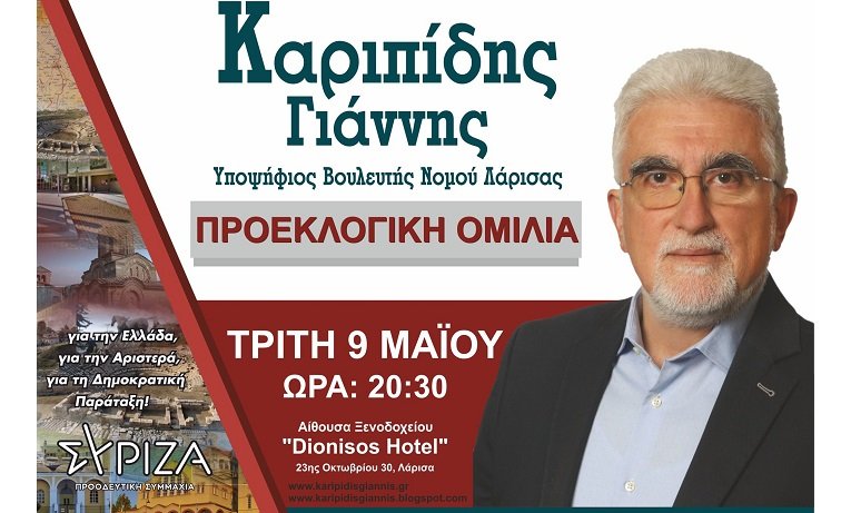 Σήμερα Τρίτη στις 8.30 μ.μ. σε αίθουσα του ξενοδοχείου Διόνυσος στη Λάρισα θα πραγματοποιηθεί η κεντρική προεκλογική ομιλία του υποψηφίου βουλευτή του ΣΥΡΙΖΑ – Π.Σ. Γιάννη Καριπίδη.