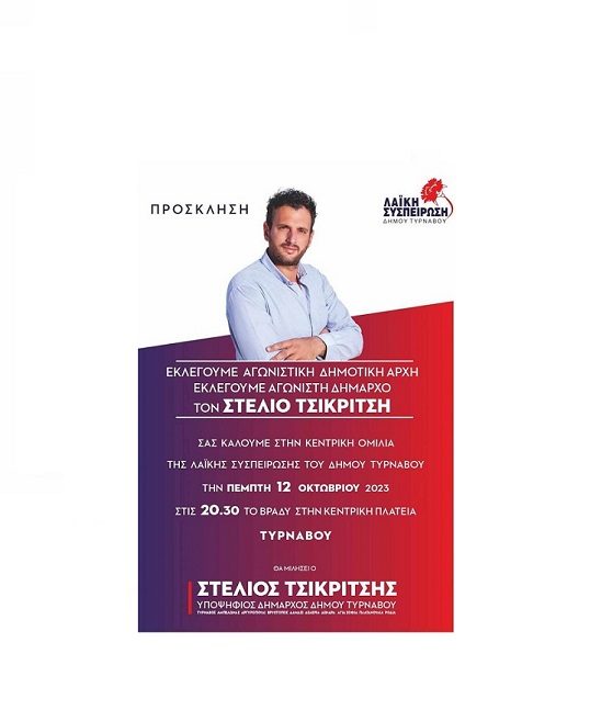 Στην κεντρική πλατεία του Τυρνάβου θα πραγματοποιηθεί σήμερα Πέμπτη 12 Οκτωβρίου στις 8.30 μ.μ. η κεντρική προεκλογική συγκέντρωση της Λαϊκής Συσπείρωσης ενόψει των εκλογών της Κυριακής.