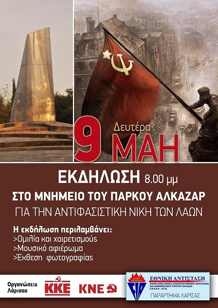 Οι οργανώσεις Λάρισας του ΚΚΕ της ΚΝΕ και η ΠΕΑΕΑ–ΔΣΕ Παράρτημα Λάρισας, διοργανώνουν εκδήλωση, με τη συμπλήρωση 77 χρόνων από την Αντιφασιστική Νίκη των Λαών, 1945 – 2022, τη Δευτέρα 9 Μάη στις 8.00 μμ στο μνημείο αφιερωμένο στην αντιφασιστική νίκη των λαών, στο πάρκο Αλκαζάρ.
