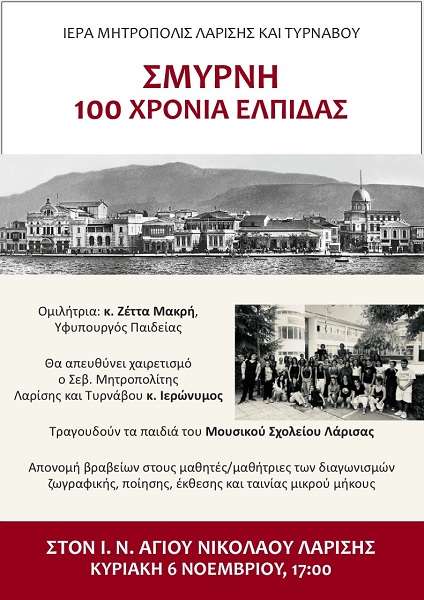 Την Κυριακή 6 Νοεμβρίου 2022 και ώρα 17:00 θα πραγματοποιηθεί η εκδήλωση της Ιεράς Μητρόπολης Λαρίσης και Τυρνάβου, με θέμα «ΣΜΥΡΝΗ 100 ΧΡΟΝΙΑ ΕΛΠΙΔΑΣ», στον Ι.Ν. Αγίου Νικολάου Λαρίσης.