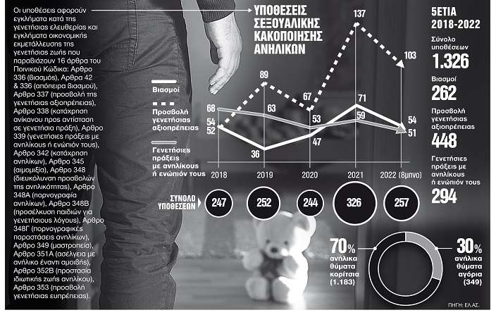 Αποτροπιασμό προκαλούν τα στοιχεία της ΕΛ.ΑΣ. και αφορούν στα εγκλήματα που σημειώθηκαν κατά της γενετήσιας ελευθερίας και οικονομικής εκμετάλλευσης της γενετήσιας ζωής με θύματα ανήλικα άτομα την τελευταία πενταετία (2018-2022). Συνολικά, οι 1.326 υποθέσεις αφορούν σε 15 άρθρα του Ποινικού Κώδικα, με τρία να καταγράφουν τα περισσότερα θύματα: Το άρθρο 334 (βιασμός) με 262 υποθέσεις, το άρθρο 337 (προσβολή της γενετήσιας αξιοπρέπειας) με 448 υποθέσεις και το άρθρο 339 που αφορά σε γενετήσιες πράξεις με ανήλικους ή ενώπιόν τους με 294 υποθέσεις.