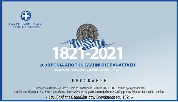 Η Περιφέρεια Θεσσαλίας, συμμετέχει στην Επετειακή Έκθεση Ελλάδα 1821 -2021 που πραγματοποιείται στο Ζάππειο Μέγαρο, στην Αθήνα, το τριήμερο 2, 3 και 4 Οκτωβρίου, υπό την αιγίδα της Επιτροπής Ελλάδα 2021. Η Περιφέρεια Θεσσαλίας διοργανώνει την Κυριακή 3 Οκτωβρίου 2021 στις 3 μ.μ. στην Αίθουσα 13 του Μεγάρου, ημερίδα με θέμα: «Η συμβολή της Θεσσαλίας στην Επανάσταση του 1821».