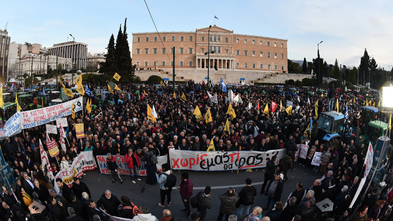 Εκατοντάδες τρακτέρ και χιλιάδες αγρότες έχουν κατακλύσει την πλατεία Συντάγματος και το χώρο μπροστά από τον άγνωστο στρατιώτη στην Αθήνα σε ένα πρωτοφανές και συγκλονιστικό συλλαλητήριο που στέλνει ηχηρό μήνυμα αγώνα και διεκδίκησης στην Κυβέρνηση.