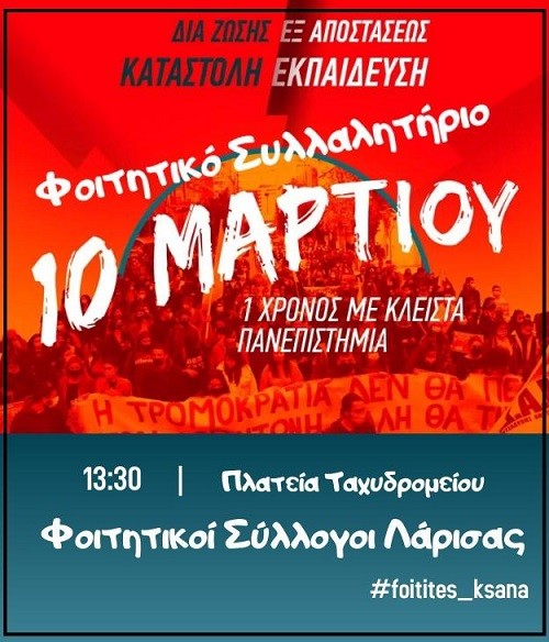 Γι’ αυτό η 10η Μάρτη γίνεται μέρα αγώνα για φοιτητές και μαθητές, αγώνα για να ξαναγυρίσουν στα θρανία τους και στα αμφιθέατρά τους, στα εργαστήριά τους, στους συμμαθητές και τους συμφοιτητές τους, στον φυσικό χώρο της ζωής τους”.