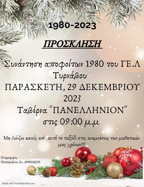 Την Παρασκευή 29 Δεκεμβρίου στις 9.00 μ.μ. στην ταβέρνα Πανελλήνιο στον Τύρναβο θα πραγματοποιηθεί συνάντηση συμμαθητών που αποφοίτησαν το 1980 από το Λύκειο Τυρνάβου.