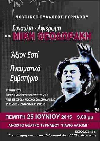 Η Χορωδία του Μουσικού Συλλόγου Τυρνάβου σε συνεργασία με την Ανδρική Χορωδία του Μουσικού Συλλόγου Λάρισας θα ερμηνεύσουν τραγούδια από το «ΑΞΙΟΝ ΕΣΤΙ » (ποίηση Οδυσσέα Ελύτη) και το «ΠΝΕΥΜΑΤΙΚΟ ΕΜΒΑΤΗΡΙΟ» (ποίηση Άγγελου Σικελιανού) σε μια συναυλία αφιέρωμα στον μεγάλο συνθέτη Μίκη Θεοδωράκη που φέτος γιορτάζονται τα 90 χρόνια του.