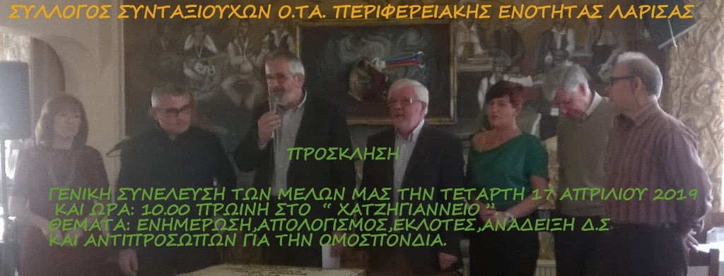 Γενική Συνέλευση του συλλόγου Συνταξιούχων ΟΤΑ Π.Ε. Λάρισας θα πραγματοποιηθεί στο “Χατζηγιάννειο” Πνευματικό Κέντρο την Πέμπτη 17 Απριλίου 2019 και ώρα 10:00 π.μ..