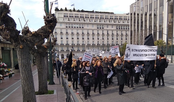 Στη συνέχεια πραγματοποιήθηκε πορεία προς τη Βουλή, όπου οι συγκεντρωμένες δικαιούχοι σύνταξης χηρείας παρέμειναν αρκετές ώρες και φώναξαν συνθήματα καλώντας τον πρωθυπουργό κ. Τσίπρα να βγει από τη Βουλή και να τους συναντήσει. Όταν ουδείς προσήλθε, χωρίς να έχει τούτο σχεδιασθεί, αποκλείσθηκαν για μικρό χρονικό διάστημα και τα δύο ρεύματα έμπροσθεν της πύλης οχημάτων της Βουλής.