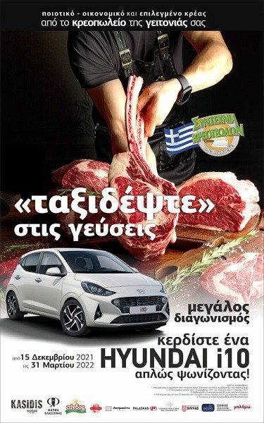 Η κλήρωση που θα γίνει παρουσία δικηγόρου αναμένεται να αναδείξει τον μεγάλο νικητή που θα κερδίσει ένα αυτοκίνητο HYUNDAI i 10 το οποίο μπορούν να διεκδικήσουν πελάτες των κρεοπωλείων της Λάρισας.