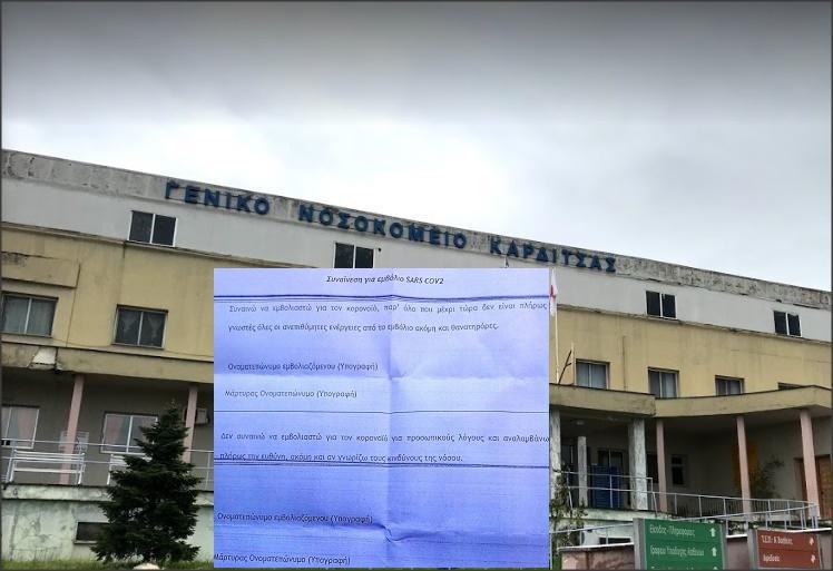Αντιμέτωποι με ένα έγγραφο απίστευτου περιεχομένου (φωτο) βρέθηκαν υγειονομικοί που έσπευσαν να εμβολιαστούν στο Γενικό Νοσοκομείο Καρδίτσας, καθώς σύμφωνα με τα όσα καταγγέλλει η ΠΟΕΔΗΝ γιατροί και νοσηλευτές κλήθηκαν να υπογράψουν έντυπο σύμφωνα με το οποίο συναινούν στον εμβολιασμό παρόλο που μέχρι τώρα δεν είναι γνωστές όλες οι ανεπιθύμητες ενέργειες από το εμβόλιο, ακόμη και «θανατηφόρες» (σ.σ. αναφέρονται ως “θανατηρόρες” στο έγγραφο)!!