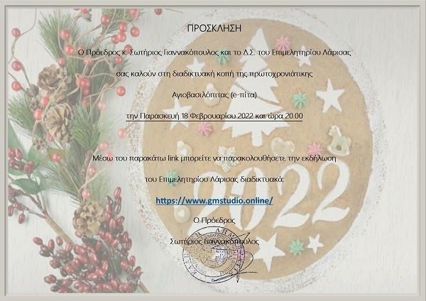 Ο Πρόεδρος κ. Σωτήριος Γιαννακόπουλος και το Δ.Σ. του Επιμελητηρίου Λάρισας σας καλούν στη διαδικτυακή κοπή της πρωτοχρονιάτικης Αγιοβασιλόπιτας (e-πίτα) την Παρασκευή 18 Φεβρουάριου 2022 και ώρα 20.00.