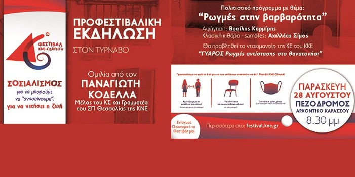 “Η προφεστιβαλική εκδήλωση στον Τύρναβο που πραγματοποιείται στα πλαίσια του 46ου Φεστιβάλ ΚΝΕ – Οδηγητή πραγματοποιείται για την προστασία των επισκεπτών του σε αναδιαμορφωμένο χώρο, για να αποφευχθεί ο συγχρωτισμός. Προστατεύουμε την υγεία τη δική μας και των υπολοίπων επισκεπτών.
