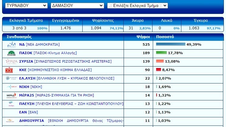 Ενα από τα χωριά του νομού που μπορεί να πει κανείς με σιγουριά ότι στις εκλογές της Κυριακής έδειξε το κλίμα που επικράτησε σε όλη τη χώρα με την ευρεία νίκη της ΝΔ και τον καταποντισμό των δυνάμεων της Αριστεράς και της Κεντροαριστεράς είναι αναμφισβήτητα το σεισμόπληκτο Δαμάσι, πάλαι ποτέ άντρο του ΠΑΣΟΚ και της σοσιαλδημοκρατίας που μέχρι και το 2015 έδινε τεράστια ποσοστά στις δυνάμεις της κεντροαριστεράς.