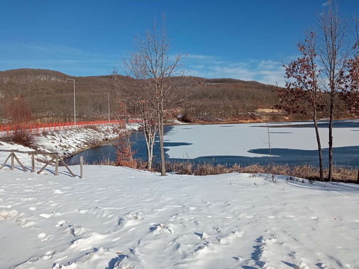 Η παγωμένη λίμνη με τη βοήθεια του ήλιου δημιουργούσε ένα υπέροχο οπτικό τοπίο με χρώματα που θύμιζαν ζέβρα πάνω στα νερά.