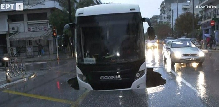 Λεωφορείο της εταιρείας Ελληνικά Πετρέλαια, που εκινείτο στην Εθνική Αντιστάσεως στη Θεσσαλονίκη και σταμάτησε για να παραλάβει δύο εργαζόμενους και όταν πήγε να ξεκινήσει, άνοιξε το οδόστρωμα και δημιουργήθηκε μεγάλη λακκούβα και το όχημα βυθίστηκε.
