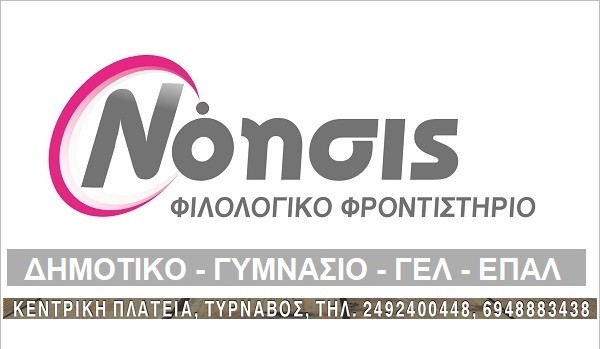 Συνεχίζονται από την Παρασκευή 19 Αυγούστου οι εγγραφές για τη νέα σχολική χρονιά στο φιλολογικό φροντιστήριο “ΝΟΗΣΙΣ” στον Τύρναβο. Οι εγγραφές θα πραγματοποιούνται καθημερινά (εκτός Σαββατοκύριακου) 7.00μ.μ. – 9.00μ.μ. για όλα τα τμήματα Δημοτικού, Γυμνασίου και Λυκείου (ΓΕΛ – ΕΠΑΛ).